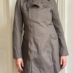 En jacka med krage och knäppning framtill. Jackan har fickor med dragkedja på sidorna och detaljer vid ärmsluten.