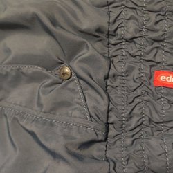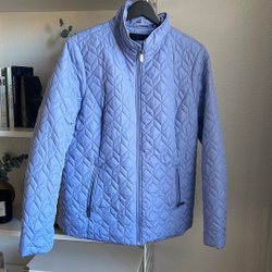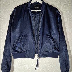 Marinblå jacka med quiltat mönster och tryckknappar. Jackan har en hög krage och dragkedja fram. Saknas nedersta knappen (se sista bilden). Använd ett fåtal gånger