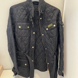 En retro jacka med huva och dragkedja framtill. Jackan har flera fickor med lock och knappar, samt knappar vid ärmslut. Skulle uppskatta storleken som en Medium.