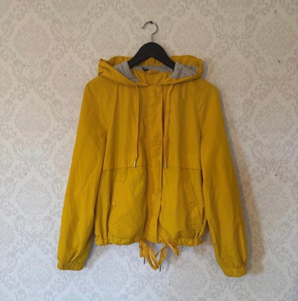 Gul jacka med huva och dragsko i nederkant. Jackan har knäppning framtill och fickor med lock.