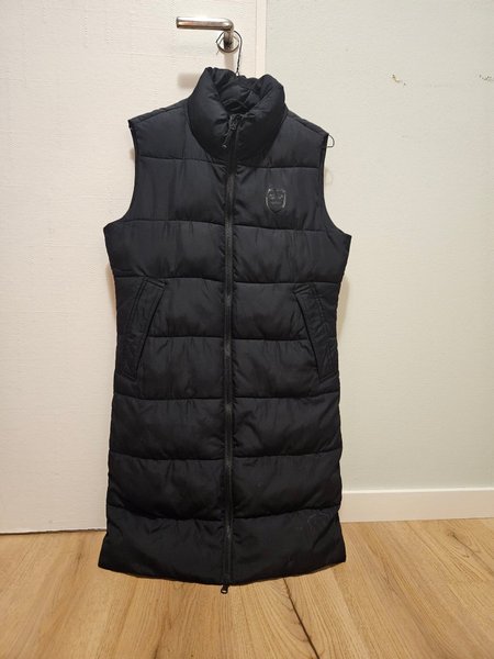 Svart, vadderad väst med hög krage och dragkedja framtill. Västen har en lång modell och två fickor fram. Fabrikat Tuxer.