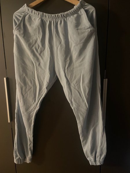 Ljusblå byxor med resår i midjan och muddar nedtill. Byxorna har fickor.