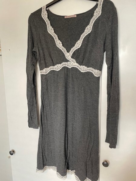 Nattlinne i mörkgrått med långa ärmar och V-ringning. Klänningen har vita spetsdetaljer längs ringningen, under bysten och längst ner på fållen, vilket ger en dekorativ touch.