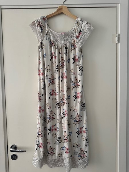 Vit nattlinne med blommigt mönster i rosa, blått och svart. Nattlinnet har korta ärmar och en rundad halsringning med spetsdetaljer. Ärmsluten och nederkanten är också prydda med spets.