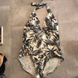 Baddräkten har en utskuren design med öppen rygg.