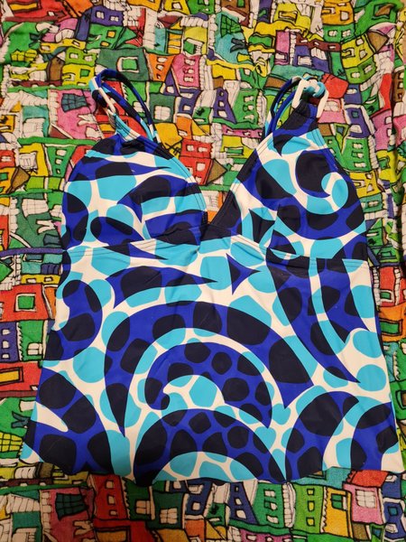 Bikini-linne med ett livfullt mönster i olika nyanser av blått och vitt. Toppen har löst sittande tyg som ger en smickrande figur.