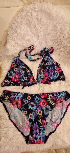 Ett matchande set med en triangelformad bikiniöverdel och bikinitrosa. Båda delarna har ett färgstarkt blommönster i nyanser av rosa, lila, blått och grönt på en svart bakgrund. Överdelen knyts runt nacken och ryggen, medan trosorna har en klassisk passform.