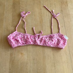 Grönmönstrad bikini. Byxorna är vändbara. Finns möjlighet att lägga i inlägg i bikinitoppen. Strl L på överdelen. Smal modell på underdelen