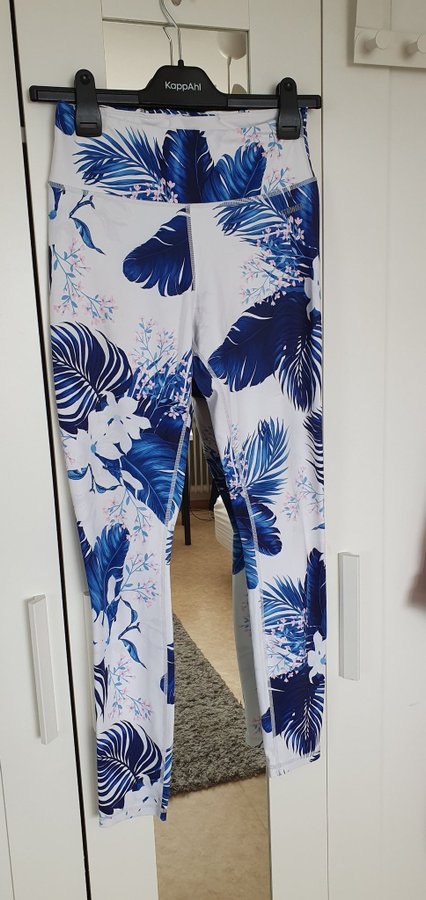 Vit träningsbyxa med ett mönster av blåa blad och rosa blommor. Byxan har en hög midja.