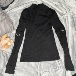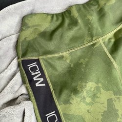 Svarta träningsbyxor med ett mönster. Byxorna har en hög midja och en åtsittande passform. Det finns en liten reva i sömmen som går att sy