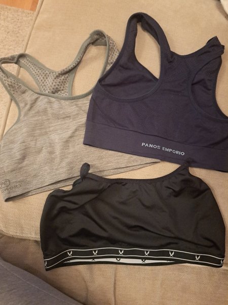 Tre sportbehåar i olika färger och modeller. En gråmelerad sportbehå med brottarrygg och prickigt mönster. En mörkblå sportbehå med texten "PANOS EMPORIO" på resåren. En svart sportbehå med smala axelband och ett vitt mönster på resåren.