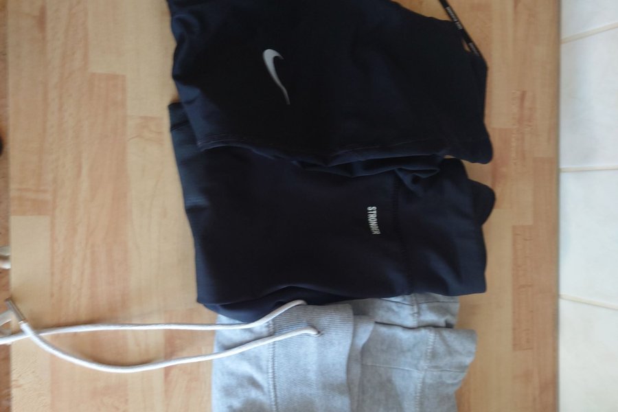 Här är ett set med träningskläder. Setet innehåller ett par gråa sweatpants, ett par mörkblåa träningsbyxor med texten 'STRONGER' och en mörkblå tröja med Nike-loggan.