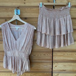 Ett fint ser med ett unikt mönster i svart och brunt på en ljus bakgrund. Kjolen har en smickrande passform med resår i midjan. Cropped toppen har en fyrkantig halsringning och puffärmar.