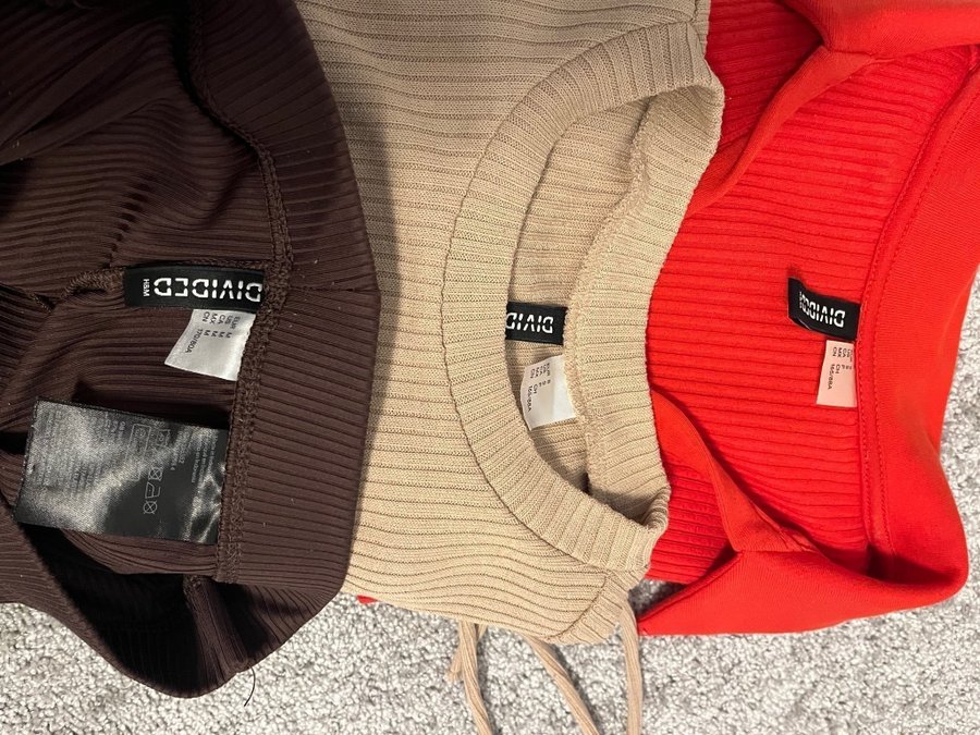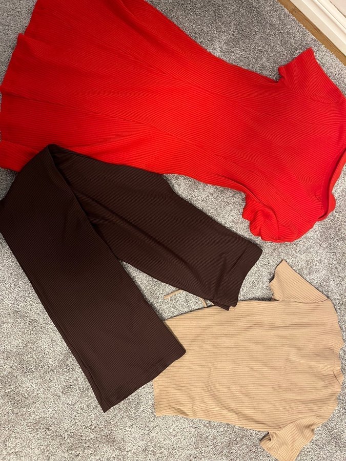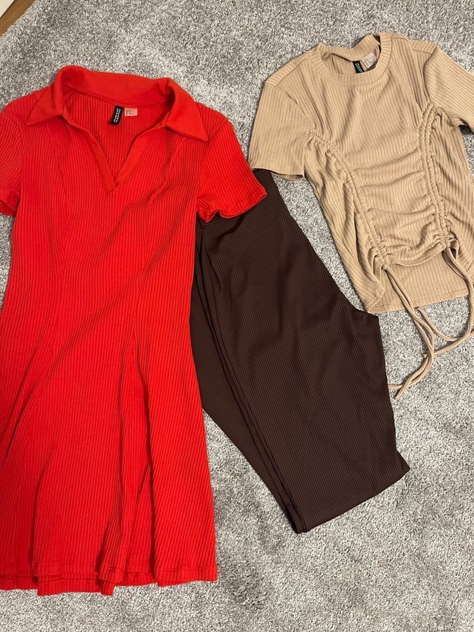 Ett set med tre plagg från Divided. Inkluderar en röd klänning med krage och korta ärmar, en beige topp med dragsko detaljer och korta ärmar, samt ett par bruna byxor med vida ben.