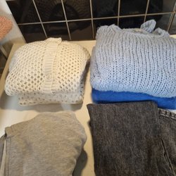 Här är ett klädpaket med olika plagg. Det inkluderar en blommig kjol, flera linnen i olika färger, en svart topp med tryck, ett par svarta byxor och ett par jeans i olika nyanser av blått och grått och lösare byxor
