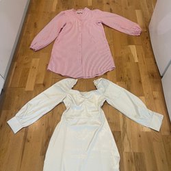 Ett paket med två klänningar. En lila klänning med ett axelband och ett lila band runt midjan. Den andra klänningen är laxrosa med en omlottdesign framtill och en liten öppning baktill.