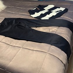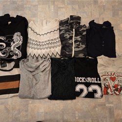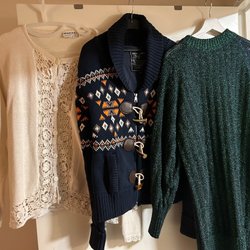Tre stycken svarta stickade tröjor, den 1:a har blixtlås i ryggen som öppnas nerifrån o upp så att man får fram de insydda spetstyget, går att ha öppen eller stängd. Den 2:a andra har knappar i ryggen hela vägen ner ärmarna på den är ribbstickade. Den 3:e är av lite tjockare material med lite vidare ärm.