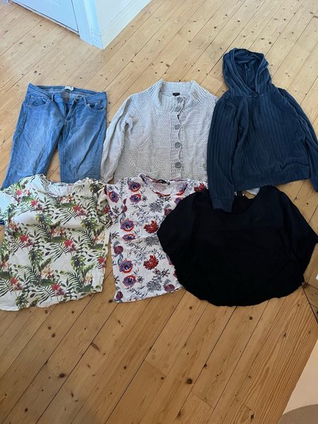 Säljer ett paket med 6 plagg. Det inkluderar ett par jeans (kortare), en stickad tröja, en huvtröja (helt ny) två t-shirt med blommönster och en svart t-shirt.