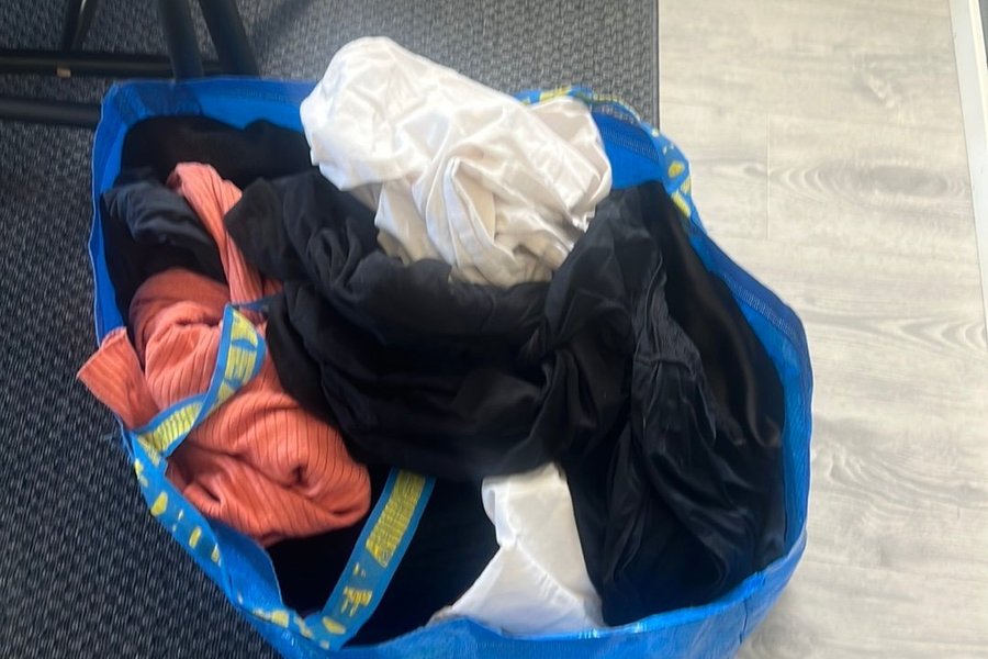 En blå IKEA väska fylld med diverse kläder. Innehåller plagg i färgerna svart, vit och korall/orange. Kläderna är vikta och ligger löst i väskan.