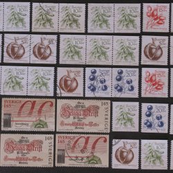 Jag har fått en rätt stor samling märken efter svärmor vet själv inte så mycket om frimärken. Jag vet inte om årtalen stämmer exakt det är efter hennes anteckningar vid insättningar i album. Jag har förstått att det är bra om man kan se baksidan också. Efter att jag fick mitt dåliga omdöme av en köpare som tyckte baksidan på ett märke av 10 hade trasig baksida så kolla även bild 2. OBS spegelvänd. Det är några som kan vara lite trasiga men lägger ändå med sådana ibland och en del baksidor kan ha spår efter inte så bra äldre fastsättningar så det kan vara en del rester efter lim och pappersrester så kolla noga kvalitet före ni budar.