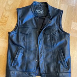 Ett par svarta läderbyxor med fickor fram och bak. Byxorna har en klassisk design och är i storlek M.