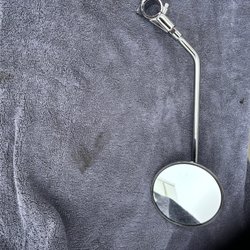 En rund spegel med justerbar vinkel som passar styren på många äldre mopeder och cyklar. Spegelarmen är 10 tum (ca 25 cm) lång och ger bra sikt bakåt utan att sticka ut för mycket.