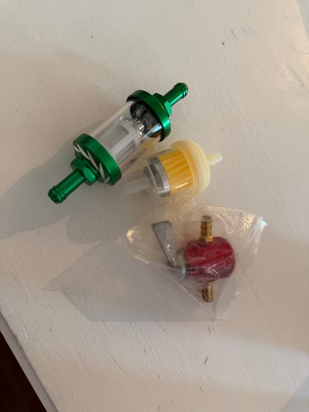 Bränslefilter i grön metall och plast. Ett mindre bränslefilter i gul plast. En bränslekran i röd metall.
