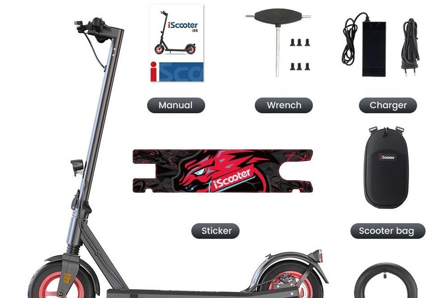 iScooter i9s, laddare, manual, skruvar, verktyg