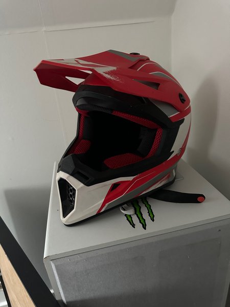 Röd och vit motocrosshjälm. Perfekt för dig som behöver en säker och snygg hjälm för dina äventyr.