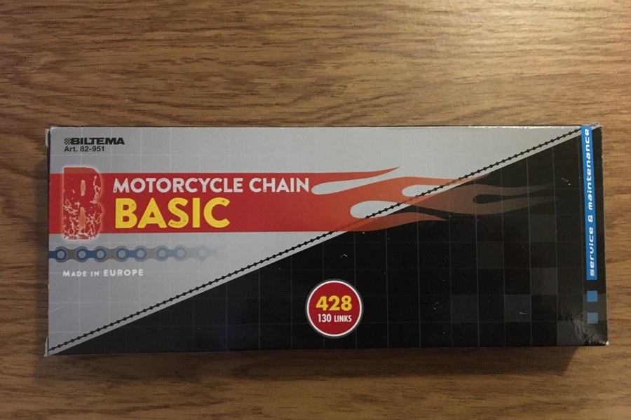 MC-kedja, 428 med 130 länkar, kedjelås. Biltema Art.nr.82-951. Tillverkad i Europa.