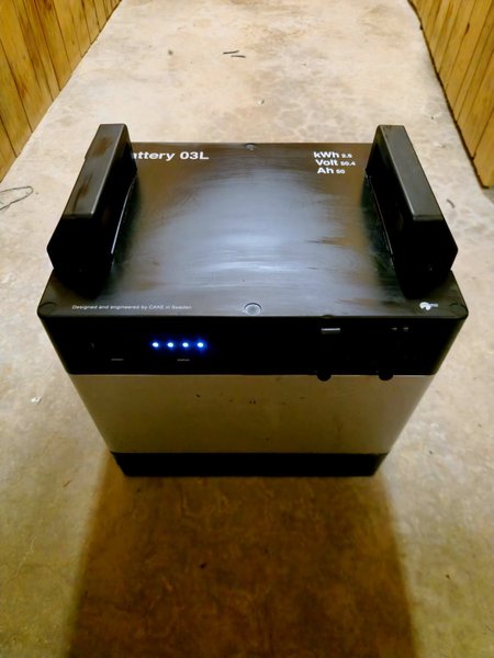 Batteri 03L från CAKE. Specifikationer: KWh 2.5 Volt 50.4 Ah 50 Designad och konstruerad av CAKE i Sverige. Batteriet har full kapacitet och är endast 8 månader gammalt och sparsamt använd