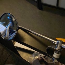 Säljer en 7 tum rund strålkastare i svart. Strålkastaren är utrustad med ledningar. Fästes mellan gaffelrören