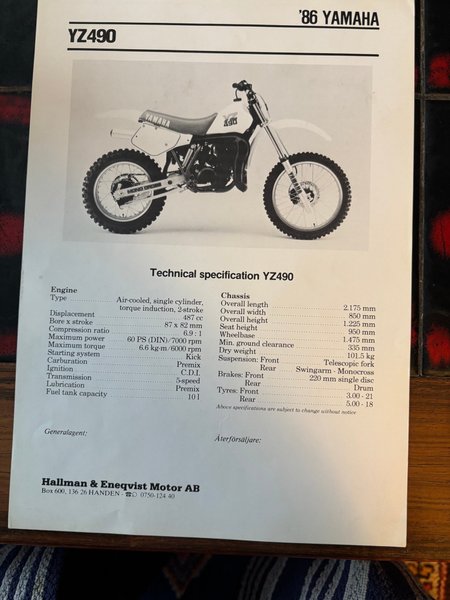 Yamaha YZ490 1986 technical spec