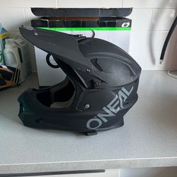 Säljer en crosshjälm. Perfekt för motocross eller annan liknande aktivitet. Den har en orange, svart och silver design. Inredningen är röd och svart.