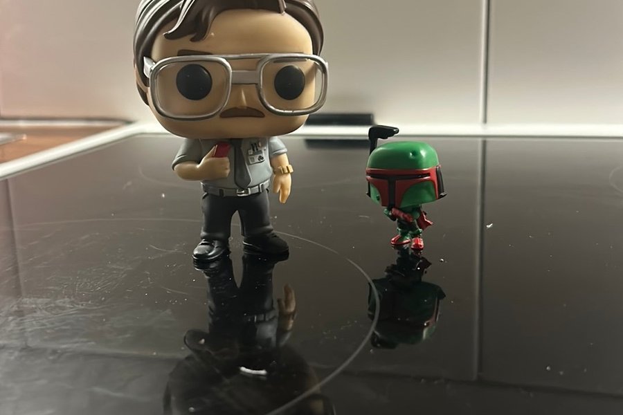 Två Funko Pop!-figurer säljes. En föreställer Milton från TV-serien Office space och den andra är Boba Fett liten versionen och