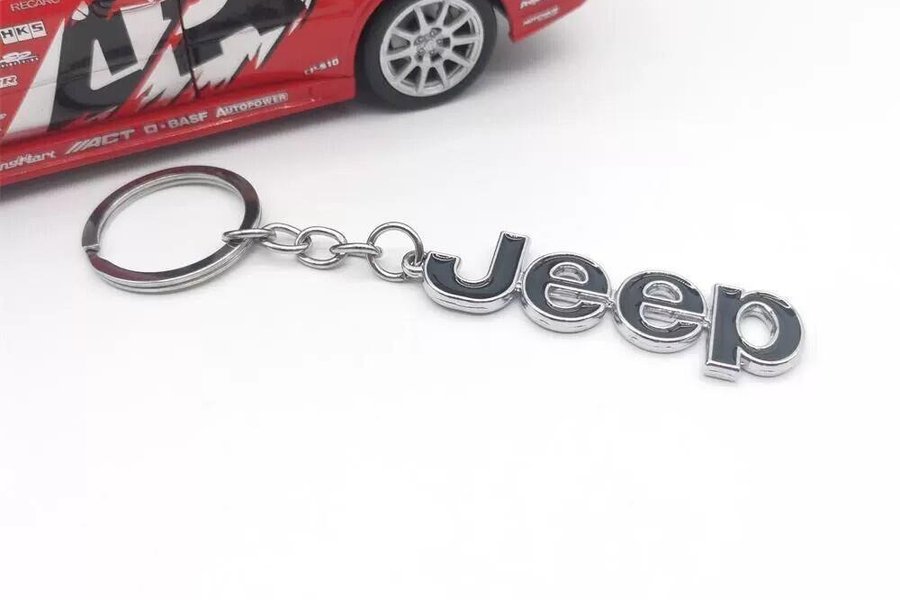 Jeep dubbelsidig nyckelring. Nyckelringen är i metall och har en silverfärgad kedja.