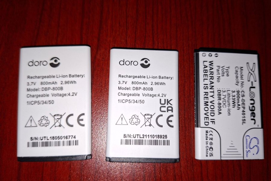 - Doro, Modell: DBP-800B, 3.7V 800mAh 2.96Wh, Chargeable Voltage: 4.2V