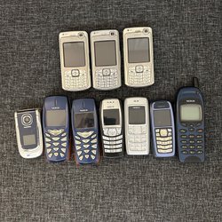 Parti med 9 mobiltelefoner. Innehåller modeller från Sony Ericsson, Nokia, Samsung och Apple.