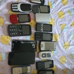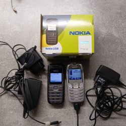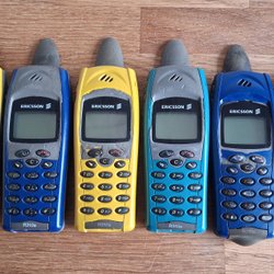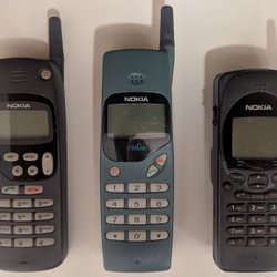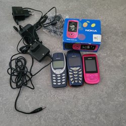 Fem mobiltelefoner från olika tillverkare. Modellerna inkluderar en Samsung viktelefon, en Nokia 3310, en Nokia 3210, en Samsung smartphone och en Nokia 6610.