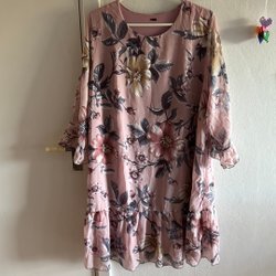 Blå tunika med trekvartsärmar och dekorativa knappar framtill. Tunikan har en rund halsringning och en avslappnad passform. Den har en lager-på-lager-design med volanger nedtill, vilket ger den en lekfull och feminin touch.