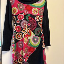Ärmlös randig tunika i grått o svart med polokrage. Tunikan har en markering i midjan. I fint skick. Storlek M, skön stickad bomull.klippt etikett.