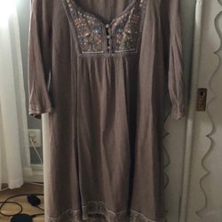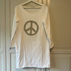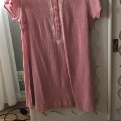 Lång tunika med halvkort ärm. Knäpps med 5 knappar. Ärmarna knäpps nedtill med 2 knappar. Det finns även ett band inuti ärmen med ett knapphål som man kan knäppa i en knapp som sitter på ovandelen ärmen. Det finns 2 fickor nedtill på tunikan. Bredd mellan axlar 36 cm och längd 92 cm. Väldigt mjukt tyg.