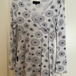 Klänning /tunika med ett blommigt mönster i gröna, vita och grå toner. Den har korta ärmar.