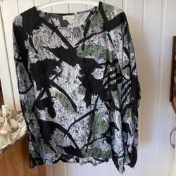 Tunika i omlottmodell med ett mönster i olika nyanser. Tunika har korta ärmar och en asymmetrisk fåll.