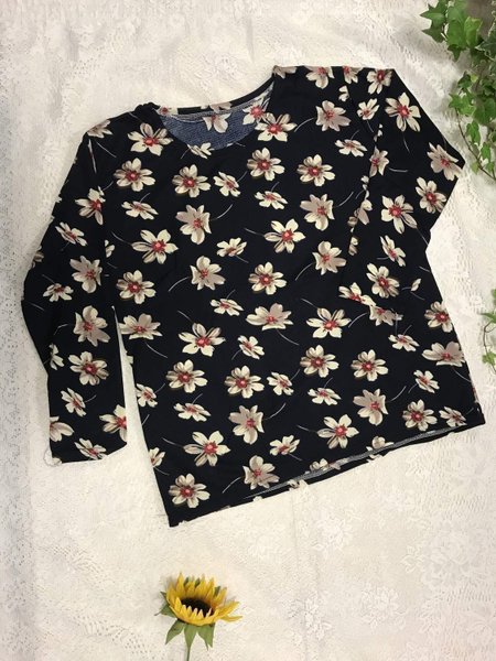Svart långärmad tröja med ett blommigt mönster i beige och rött. Tröjan har en rund halsringning.