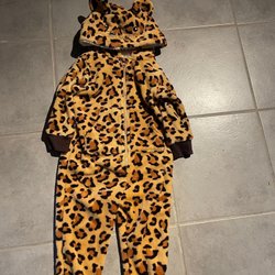 Vadderad väst med huva i leopardmönster. Västen har dragkedja fram och två fickor. Sparsamt använd