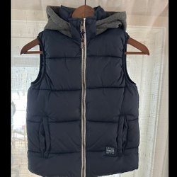Marinblå vadderad väst från Lupilu med hög krage och dragkedja fram. Västen har två fickor fram med knappstängning. Stl 110, 4-5 år.