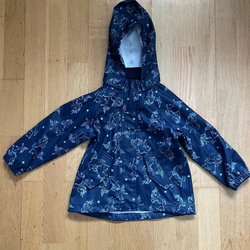 Vadderad väst med huva. Västen har ett mönster med djur och blommor.