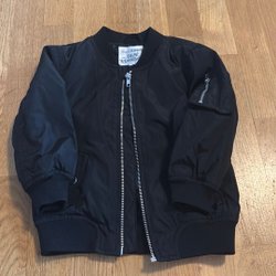 Svart jacka med dragkedja och fickor framtill. Jackan har en hög krage och en logotyp på bröstet.