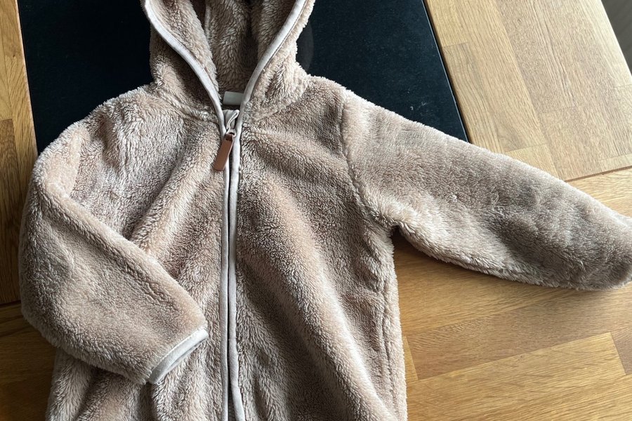 Mjuk och gosig beige fleecejacka med huva. Jackan har en dragkedja framtill och en ljusare kant runt dragkedjan och huvan.